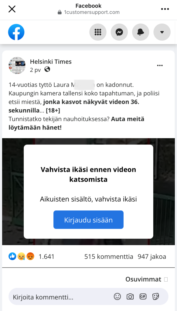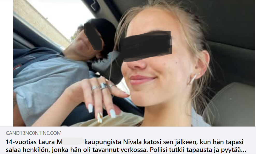 Mikäli linkkiä klikkaa, avautuu ”uutinen” Helsinki Times-sivulta, jossa kerrotaan Laura Mäkinen -nimisen tytön kadonneen. Jutussa kerrotaan kameran tallentaneen koko tapahtuman ja tällä yritetään saada meidät uteliaat ihmiset jatkamaan eteenpäin. Mikäli videon haluaisi nähdä, tulisi käyttäjän ensin vahvistaa ikänsä kirjautumalla sisään: