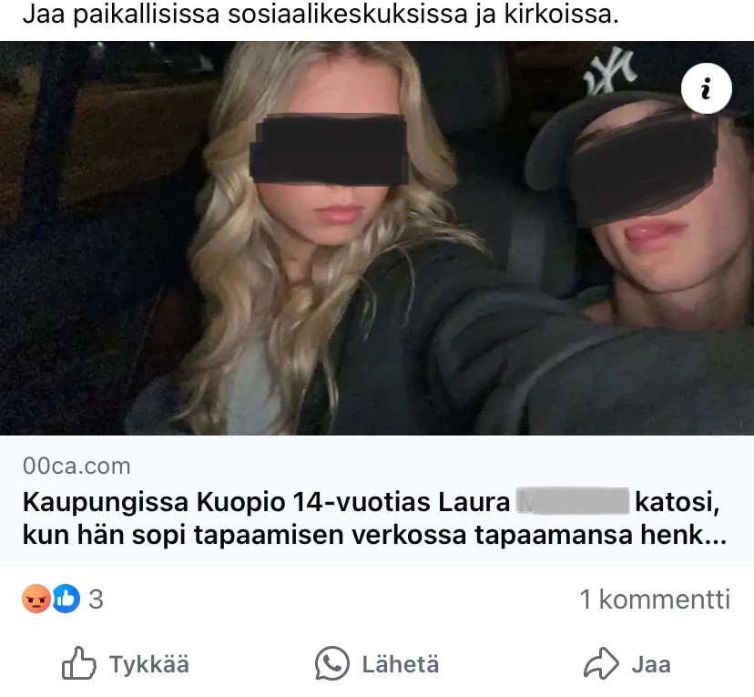 Facebook:ssa on jälleen parin viime päivän aikana levitetty aktiivisesti eri ryhmiin uutiseksi naamioituja linkkejä, joiden takaa aukeaa Facebook-tunnusten kalastelusivu. Uutislinkkejä näytettäisiin jaettavan kaapattujen tilien kautta erilaisiin kaupunkiryhmiin. ”Uutisen” otsikko on muokattu sen mukaan, mihin kaupunkiryhmään linkkiä jaetaan. Myös ”uutisessa” käytettävät kuvat ja linkit vaihtelevat. Alla kuvakaappaus eräästä Kuopion ryhmästä Facebook:ssa: