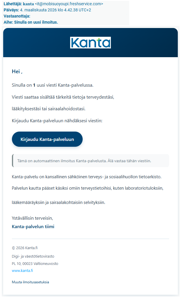 Viestissä kerrotaan vastaanottajalla olevan 1 uusi viesti Kanta-palvelussa. Viesti saattaa sisältää tärkeitä tietoja terveydestäsi, lääkityksestäsi tai sairaalahoidostasi.