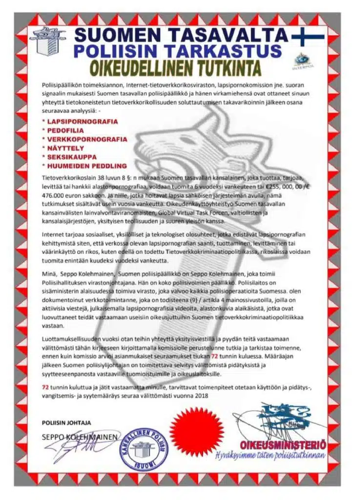Viestissä väitetään vastaanottajan syyllistyneen rikoksiin ja poliisilla uhkaillen määrätään vastaamaan 72 tunnin kuluessa. Muuten ryhdytään oikeustoimiin ja kakkua 🎂 on tulossa.