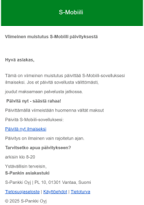 Ilmainen S-Mobiili -päivitys❗ Tietojenkalastelua S-Pankki nimissä. Viestissä kehotetaan päivittämään S-Mobiili -sovellus välittömästi. Mikäli päivitystä ei tekisi, joutuisi jatkossa maksamaan palvelusta. Päivitys tapahtuisi linkin kautta, joka johtaa tietojenkalastelusivulle (tässä viestissä ollut…