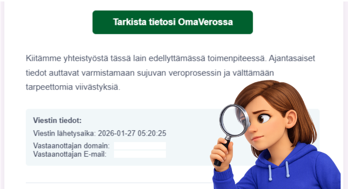 Vastaanottajaa pyydetään tarkistamaan asiakastiedot, jotta verotiedotteet ja laskut saapuvat oikeaan osoitteeseen sekä maksut suoritetaan oikeille tileille.