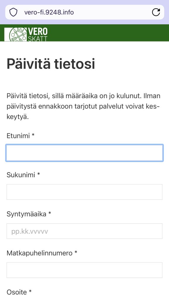 Siispä viestissä oleva linkki johtaa tietojenkalastelusivulle, jossa kysellään nimi- osoite- ja puhelinnumerotiedot sekä syntymäaika ja tilinumero. Näiden tietojen syöttämisen jälkeen käyttäjä ohjataan oikealle vero[.]fi sivulle.