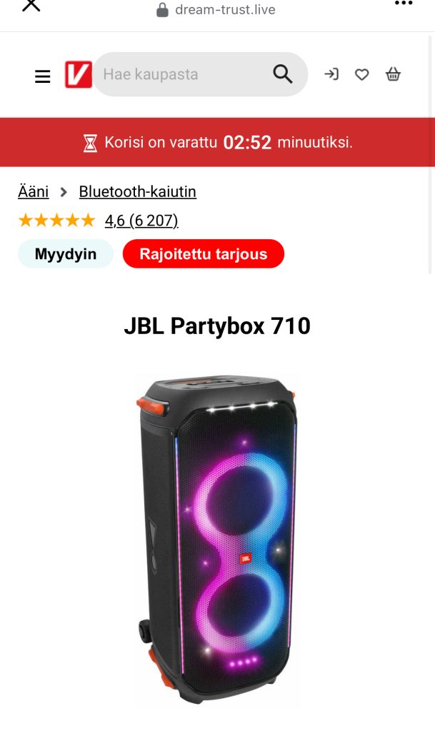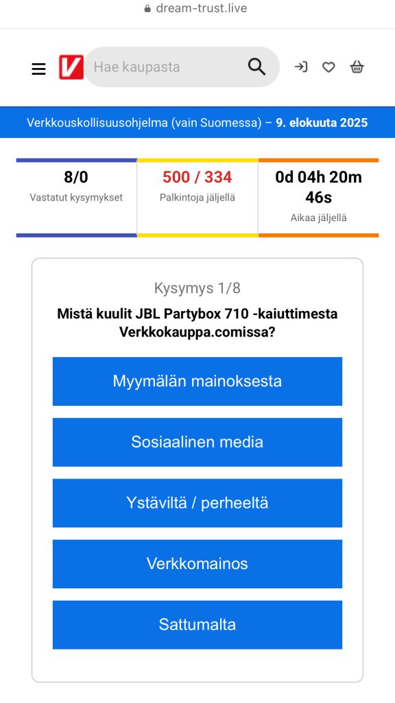 Linkki johdattaa huijaussivustolle, joka on tehty näyttämään Verkkokauppa.comin sivulta. Kävijälle luodaan kiireen tunnetta näyttämällä minkä verran aikaa tarjous on enää saatavilla. Lisäksi ilmoitetaan minkä verran palkintoja on jäljellä 500/352.