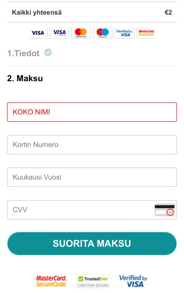 Sen jälkeen kalastellaan nimi- ja osoitetiedot sekä puh.numero ja sähköpostiosoite. Seuraavalla sivulla pääsee eroon maksukorttitiedoistaan 💳