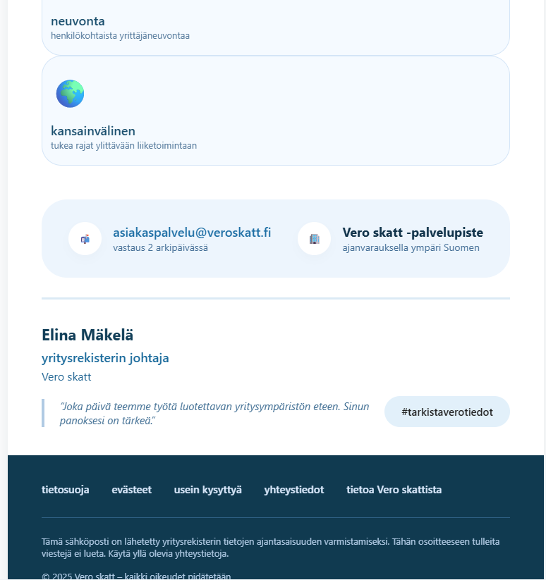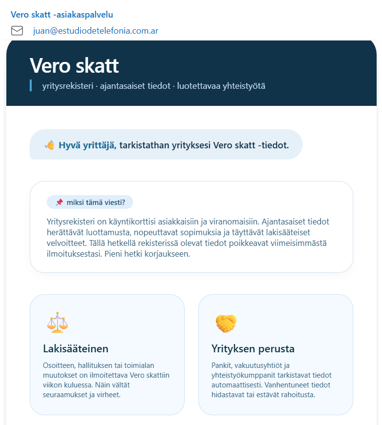 Yrittäjää pyydetään tarkistamaan Vero skatt -tiedot. Viestissä on linkki (hyperplume[.]mypi[.]co/index7[.]php), joka johdattaa tietojenkalastelusivulle.